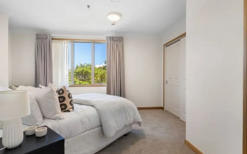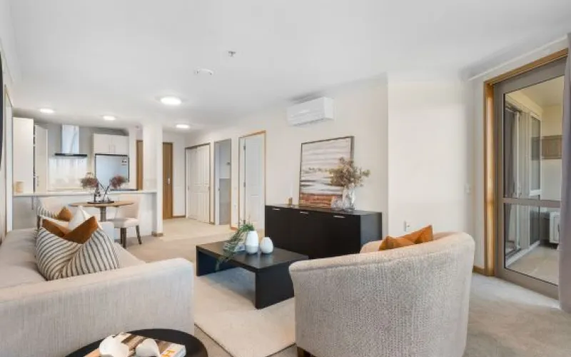 This light-filled two-bedroom apartment features an open-plan lounge and dining area opening onto a generous balcony. The designer kitchen includes modern appliances and underfloor heating, while bathrooms are spacious and well appointed, also with underfloor heating. Double glazing, a heat pump, undercover parking and ample storage add everyday comfort and peace of mind.