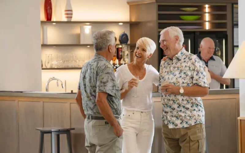 The Lodge is the heart of the village and includes three lounges, two dance floors (also used for stretch and balance classes, yoga, dancing, indoor bowls and Tai Chi), a heated indoor pool, spa, sauna, fully equipped gym, billiards and pool tables, a library, hairdressing salon, workshop, movie theatre and games room for Rummikub, cards and Mah Jong. There is also a resident-favourite Happy Hour Bar.