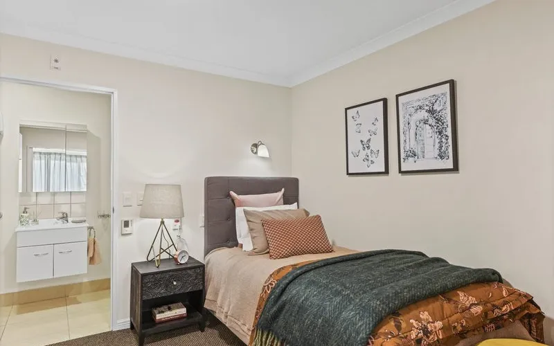 Open your French sliding doors to access a private patio with a stunning, spacious west-facing garden and pergola. Enjoy the warmth of the afternoon sun in your living space that seamlessly flows to your bedroom, complete with an ensuite for added convenience. Perfectly positioned on the ground floor you are only a stroll away from all the village amenities.