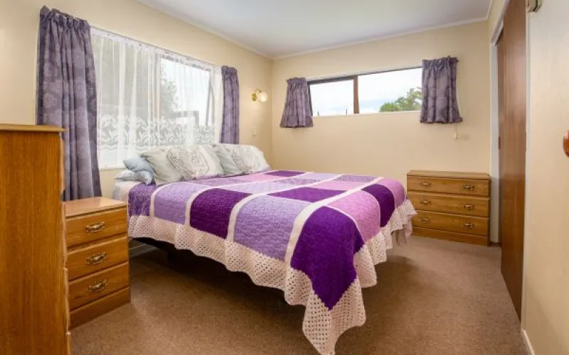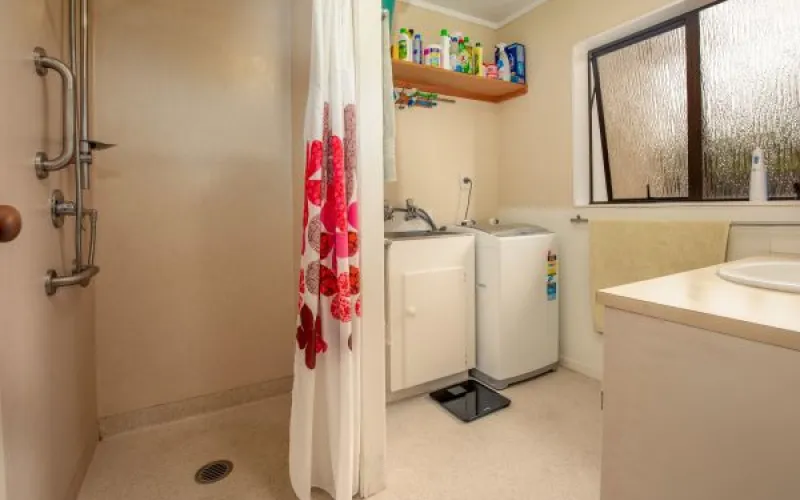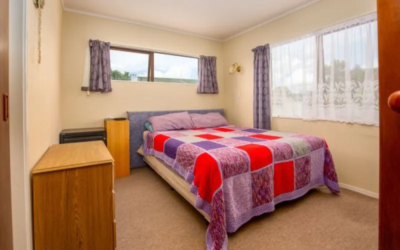 The two double bedrooms provide comfortable retreats, each designed for relaxation and rest. The bathroom is equipped with a vanity and a wetfloor shower, cleverly incorporating the laundry and hot water cylinder for efficiency. A separate toilet with a sink adds convenience for residents and guests alike.