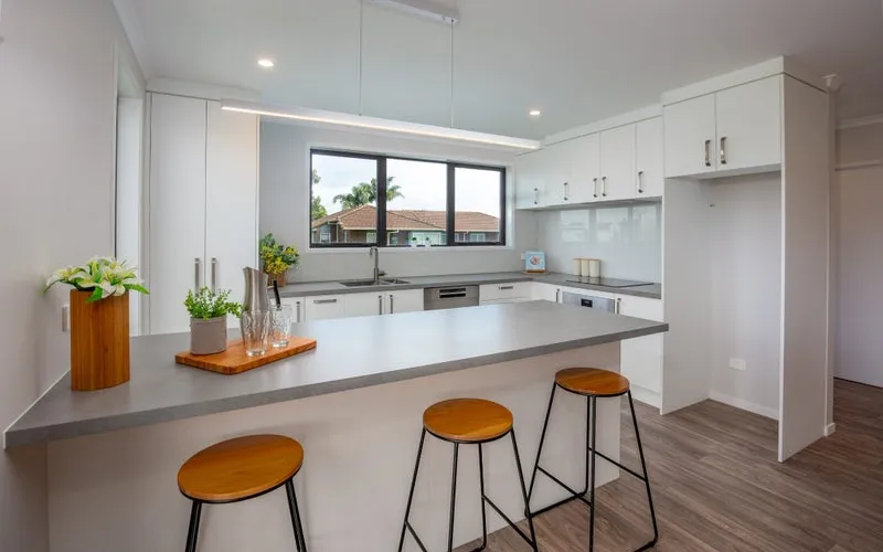 The kitchen is designed for everyday ease, featuring a breakfast bar, under-bench oven, cooktop, full dishwasher, and microwave shelf. With ample cabinetry, hidden bins, and a pantry, storage and style go hand in hand.