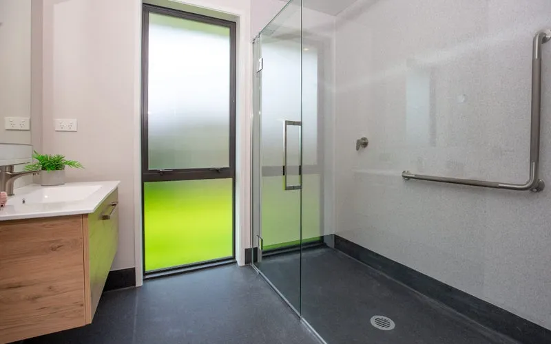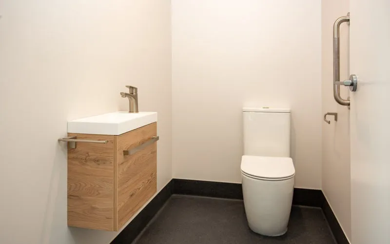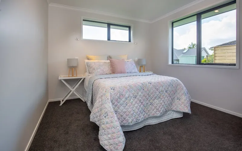 The home offers a master bedroom and a spare bedroom, both designed for quiet comfort. The bathroom includes an accessible wet-floor shower, wall-hung vanity, heated towel rail, and heat lamp, while the separate toilet features its own basin for convenience.