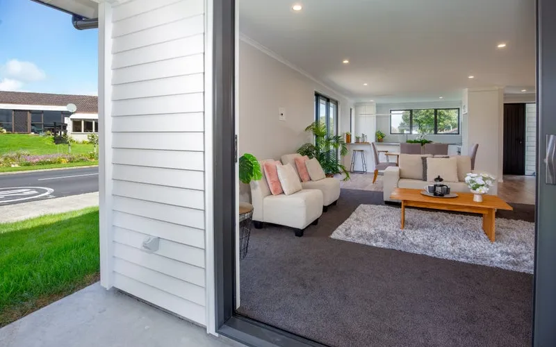 Step through the sheltered entrance into a light-filled open-plan living, dining, and kitchen area — the true heart of the home. The living room opens effortlessly through stacker doors to a large covered portico, perfect for year-round entertaining.