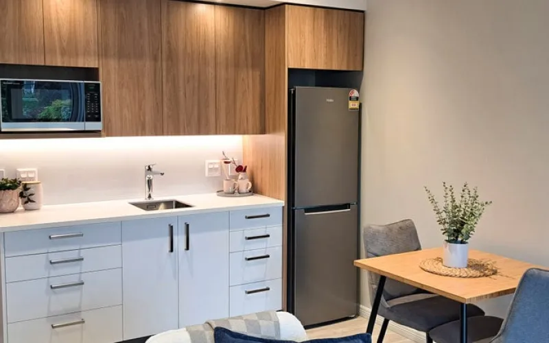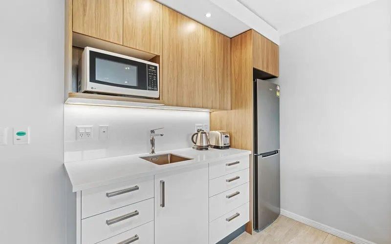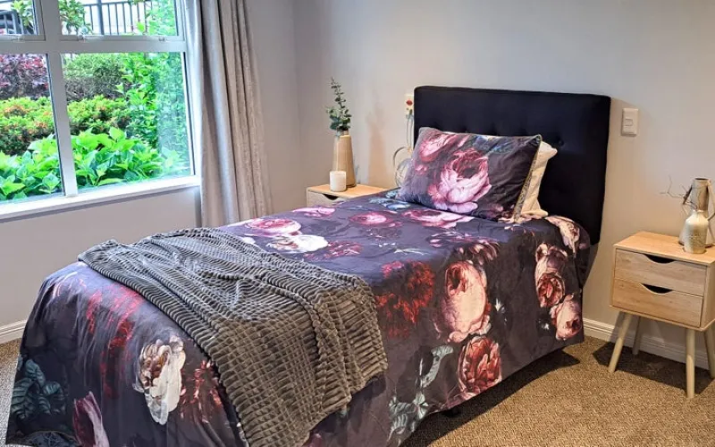 Enjoy walking out onto your own ground floor private patio area from your lounge. This serviced apartment offers an open plan layout, kitchenette, and a beautiful bedroom with ensuite. Soak up the afternoon sun and take in tranquil views of the gardens and hills or go for a short walk to the village centre to make the most of the amenities on offer. This apartment has been beautifully modernised, with a full kitchenette and bathroom replacement, as well as new LED lighting, paint, carpet, and curtains.
